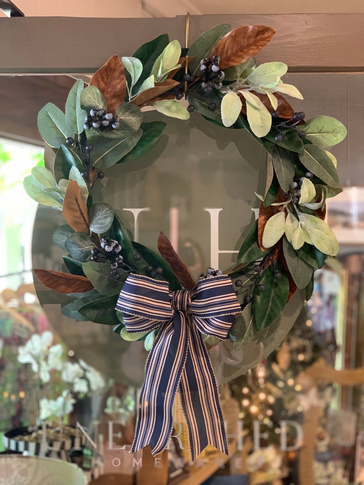 A beautiful yet simple wreath for your window sill, front door or mantel. Adorned with blueberries and a gorgeous matching bow.